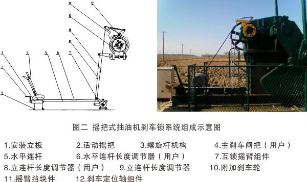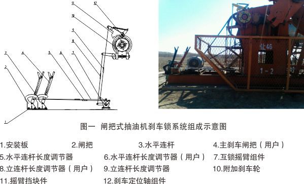 CSS型抽油機剎車鎖是在原有抱閘式剎車系統(tǒng)上增加一套鎖死裝置,該剎車鎖采用突塊與凹槽嵌入卡死的機械原理使剎車輪在剎車后完全可靠的卡死,為抽油機剎車提供了雙重保險,避免了原有剎車系統(tǒng)在雨雪天或蹄片失效時打滑溜車現(xiàn)象的發(fā)生,從而確保了操作人員的安全。